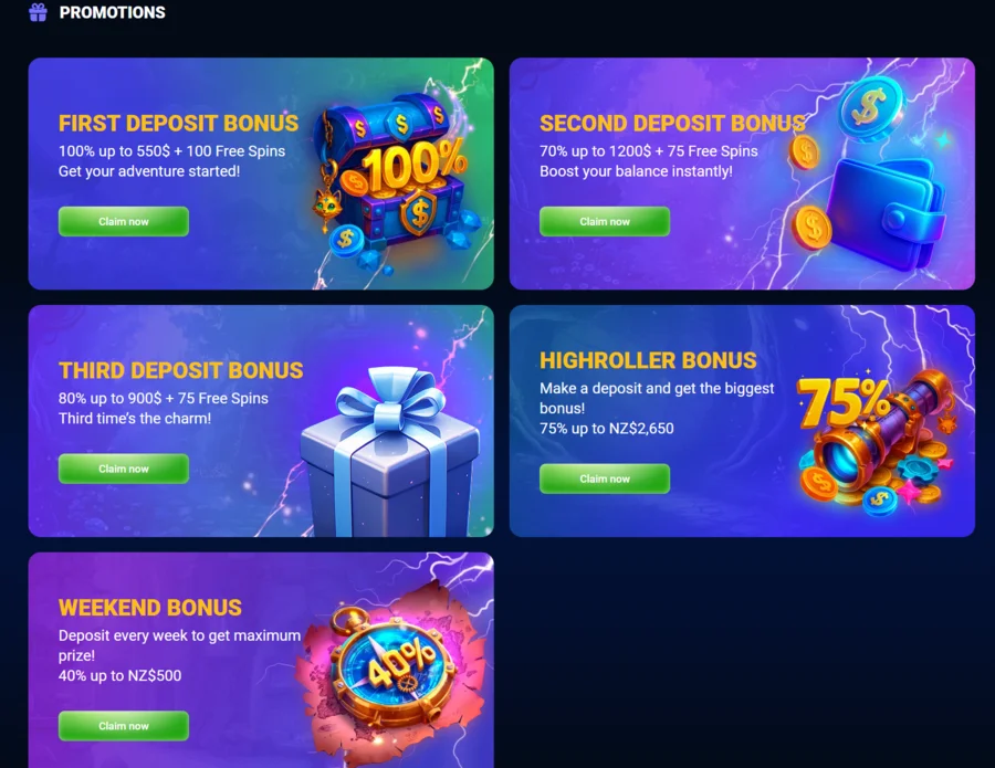 This 75% match bonus is designed for players who prefer making larger deposits. The bonus goes up to NZ$2,650, with the same NZ$8 maximum bet limit that applies to other promotions. Players from Finland face higher 70x wagering requirements due to regional regulations.